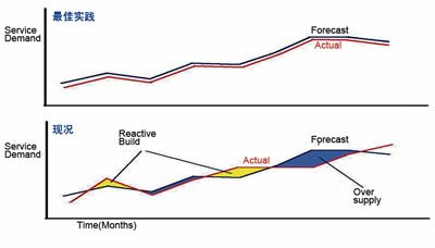 下一代網(wǎng)絡(luò)的IP化、智能化的趨勢,使得服務(wù)路徑從靜態(tài)路由為主向動(dòng)態(tài)化、共享化轉(zhuǎn)變。這種轉(zhuǎn)變使得主動(dòng)的網(wǎng)絡(luò)容量規(guī)劃在下一代運(yùn)營環(huán)境中具有更加重要的意義。準(zhǔn)確、真實(shí)、主動(dòng)的網(wǎng)絡(luò)容量計(jì)劃和趨勢分析能力將成為對(duì)OSS解決方案的關(guān)鍵需求。網(wǎng)絡(luò)規(guī)劃不僅可以幫助運(yùn)營商準(zhǔn)確分配網(wǎng)絡(luò)容量,而且可以減少容量不足和失敗訂單,并可通過找出利用率不足的網(wǎng)絡(luò)資源來提高網(wǎng)絡(luò)運(yùn)行效率,如圖3所示。