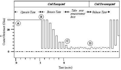 1) Operate Time:驅(qū)動(dòng)電路推動(dòng)繼電器直至開關(guān)第一次閉合的時(shí)間,為A-B區(qū)段。