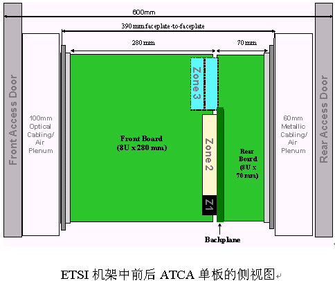 PICMG 3.0機構要求主要來自于對600mm ETSI 和19" EIA標準機柜空間使用的研究。PICMG 3.0委員會在考慮單板尺寸能支持下一代元器件對物理和散熱的需求的同時,機箱空間能和板子能達到最大限度的配合和利用。最初的工作是基于歐規(guī)卡的標準,繼而又提升到支持低成本的片狀金屬架構(簡單電訊封裝)。對后走線模塊的支持滿足了對后I/O應用的需求。在決定可以使用的單板空間時,也充分考慮了前、后板的進深范圍以供大量電纜束綁空間。經(jīng)過對不同規(guī)格尺寸的單板的優(yōu)點進行討論之后,PICMG 3.0組織統(tǒng)一規(guī)格如下:前板 8U x 280mm,進深1.2" pitch,選配后板8U x 70mm深。基于1.2" pitch,19" EIA機框可以支持14槽,而600mm ETSI的機框可以支持16槽。下圖所示為600mm ETSI機架中的ACTA前后單板的側視圖: