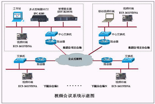 整個視頻會議系統(tǒng)采用EC5-1611VDNA作為會議室型視頻終端及FSC-1713VNA作為多點會議服務(wù)器?梢栽O(shè)立一個或者多個中心,通過數(shù)字傳輸信道,星形級聯(lián)而成。