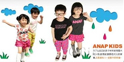 除了衣服質(zhì)感舒適,ANAP KIDS以款式流行、設(shè)計(jì)CUTE的市場定位也贏得 不少青睞者的追捧。更有小物件、配飾等多類商品,滿足了喜歡時(shí)尚、裝扮的母親們想讓自己孩子穿得和其他人與眾不同衣服的需求。繼承了ANAP傳統(tǒng)的ANAP KIDS是一個(gè)非常“奔放”、“充滿活力”的品牌,致力于協(xié)助父母給予最可愛的他(她)最安全、最舒適的呵護(hù),將潮流、關(guān)愛、成長的生活觀念傳遞到每個(gè)家庭,讓所有3-6歲兒童共享同一份快樂。