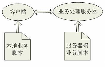 整個(gè)業(yè)務(wù)數(shù)據(jù)和業(yè)務(wù)處理都由XML配置管理,系統(tǒng)業(yè)務(wù)被分成本地業(yè)務(wù)邏輯和服務(wù)器端業(yè)務(wù)邏輯,客戶端通過(guò)提取本地業(yè)務(wù)邏輯腳本中的數(shù)據(jù)處理業(yè)務(wù)邏輯,業(yè)務(wù)處理服務(wù)器通過(guò)提取服務(wù)器端業(yè)務(wù)邏輯腳本中的數(shù)據(jù)訪問(wèn)數(shù)據(jù)庫(kù),并將數(shù)據(jù)庫(kù)返回結(jié)果發(fā)往客戶端。本地業(yè)務(wù)邏輯和服務(wù)器端業(yè)務(wù)邏輯之間的邏輯關(guān)系是通過(guò)一套配置腳本維護(hù)。如圖: