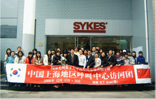 2006年12月14日上午,韓國(guó)光州女子大學(xué)呼叫市場(chǎng)營(yíng)銷系30多名大學(xué)學(xué)生 在鄭成教授等的帶領(lǐng)下,專程來(lái)滬參觀訪問(wèn)賽科斯(Sykes)公司。韓國(guó)光州女子大學(xué)是韓國(guó)第一個(gè)設(shè)立呼叫市場(chǎng)營(yíng)銷專業(yè)的大學(xué),該專業(yè)為四年制本科,學(xué)生畢業(yè)后主要從事客戶服務(wù)行業(yè)的基層管理崗位工作。