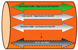 在上例中,在一個(gè)千兆端口上,為關(guān)鍵性應(yīng)用ERP預(yù)留了嚴(yán)格的10%的帶寬資源;為Voice Over IP的應(yīng)用預(yù)留了嚴(yán)格的2%的帶寬資源;為低優(yōu)先級(jí)的廣播流量預(yù)留了最大5%的帶寬資源,……….為HTTP應(yīng)用僅定義為最為普通的Best Effort。
