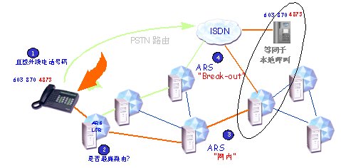 如果,一個網(wǎng)絡(luò)用戶想與一個外線用戶通話。ARS應(yīng)用程序分析所撥號碼。根據(jù)不同的呼叫方向,選擇最廉費用的運營商,而不管網(wǎng)絡(luò)內(nèi)的物理連接。地址信息將會被修改,從而符合該運營商的編號計劃(增加,刪除或轉(zhuǎn)換數(shù)字),并且被叫號碼和轉(zhuǎn)換后的號碼將會被存貯在呼叫詳細(xì)記錄(CDR)內(nèi)。