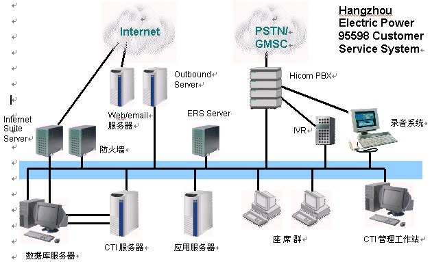 西門子Hicom 350E,作為杭州電力"95598"客服系統(tǒng)的通信服務(wù)器,以其出色的品質(zhì)和強大的功能保證了整個系統(tǒng)的正常運行。同時充分利用杭州電力局原有的通訊線路,創(chuàng)新性的在原有的SDH(同步數(shù)字體系)網(wǎng)絡(luò)上利用HiPath HG 3200遠端模塊,將中心的人工坐席延伸到了五個郊縣電力公司,真正解決了全市統(tǒng)一接入,一個號碼對外,業(yè)務(wù)本地受理的問題;同時遠端坐席的工作方式真正做到和中心完全一致,給使用、管理、培訓等帶來極大的便利。