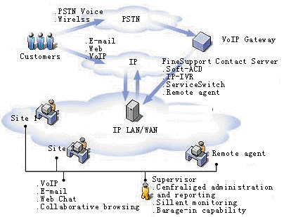 在整個FineSupport系統(tǒng)中,看不到傳統(tǒng)呼叫中心系統(tǒng)中價值昂貴的PBX程控交換機、CTI服務器,在共有的模塊中,如IVR、ACD中,也沒有用傳統(tǒng)的硬件方式實現(xiàn),而采用了便于升級和拓展新業(yè)務內(nèi)容的Internet技術和軟件技術。