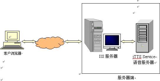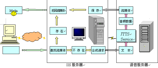 語音服務(wù)器方案是指利用捷通華聲在CTI領(lǐng)域成熟應(yīng)用的jTTS Service語音服務(wù)器,增加一臺(tái)或多臺(tái)語音服務(wù)器到現(xiàn)有的IIS服務(wù)系統(tǒng)的網(wǎng)絡(luò)環(huán)境中;在IIS服務(wù)器中,增加訪問語音服務(wù)器的功能。當(dāng)IIS服務(wù)器需要流媒體輸出時(shí),向語音服務(wù)器發(fā)出請(qǐng)求,語音服務(wù)器接受IIS服務(wù)器的請(qǐng)求,并對(duì)請(qǐng)求的數(shù)據(jù)進(jìn)行合成、格式轉(zhuǎn)換,得到流媒體后返回給IIS服務(wù)器,IIS服務(wù)器再將此流媒體傳輸給用戶。