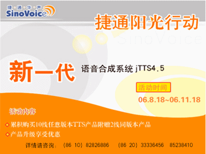 2006年8月18日,北京捷通華聲語(yǔ)音技術(shù)有限公司正式發(fā)布捷通華聲新一代語(yǔ)音合成系統(tǒng)jTTS4.5。為慶祝jTTS4.5的正式上市,同時(shí)也為回饋廣大用戶,為期三個(gè)月,推廣jTTS4.5的捷通華聲“陽(yáng)光行動(dòng)”同步全面啟動(dòng)!