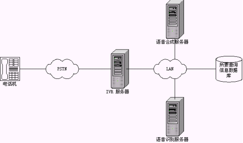 這種模式是最常見(jiàn)的一種接入情況。將原有煩瑣的按鍵式提示改成更具人性化的交談式語(yǔ)音交互,類(lèi)似于語(yǔ)音門(mén)戶(hù)模式。這是目前大家普遍認(rèn)同的一種語(yǔ)音識(shí)別技術(shù)應(yīng)用方式。相比原有的按鍵方式,系統(tǒng)的新穎程度、個(gè)性化程度、用戶(hù)操作的方便程度等都得到了極大的提高,如語(yǔ)音識(shí)別技術(shù)在股票查詢(xún)中的成功應(yīng)用,在點(diǎn)歌系統(tǒng)中的成功應(yīng)用等;另外利用語(yǔ)音識(shí)別技術(shù)也解決了一些原有系統(tǒng)無(wú)法實(shí)現(xiàn)的技術(shù)難題,如火車(chē)時(shí)刻查詢(xún)、機(jī)場(chǎng)航班查詢(xún)等,原有系統(tǒng)借助郵政編碼、電話區(qū)號(hào)等的方式讓人無(wú)所適從,現(xiàn)在直接和系統(tǒng)交談,順利獲取所需信息,可以說(shuō)是語(yǔ)音識(shí)別技術(shù)一個(gè)成功的應(yīng)用。這種系統(tǒng)的拓?fù)浣Y(jié)構(gòu)如下圖示: