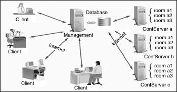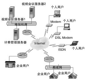 用戶可通過從56K撥號上網(wǎng)直至寬帶等各種方式接入該視頻會議系統(tǒng),包括PSTN撥號、ISDN撥號、ADSL撥號、LAN、PLC(低壓電力載波)等各種形式,在這個統(tǒng)一的視頻會議平臺上,實現(xiàn)多路音頻、多路視頻、文檔共享、電子白板、協(xié)同瀏覽、文件傳輸、文字交流等功能。系統(tǒng)的拓撲結(jié)構(gòu)圖如左所示。