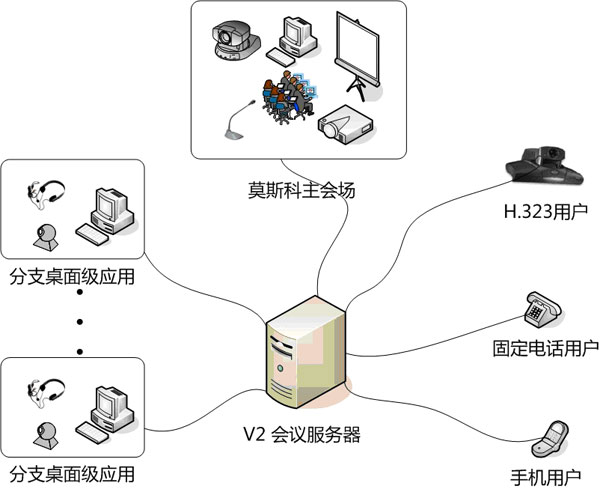 俄羅斯百事可樂公司莫斯科總部和俄羅斯其它各地分支機構通過公眾互聯(lián)網(wǎng)連接,以V2視頻會議系統(tǒng)為紐帶,將不同的參會用戶連接在一起,實現(xiàn)即時的音視頻溝通及數(shù)據(jù)協(xié)作。不僅是普通的PC機用戶,包括傳統(tǒng)H.323用戶,手機和固定電話用戶等都可以加入V2視頻會議。