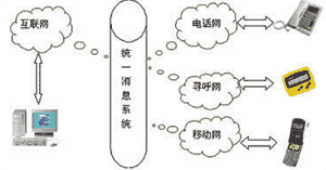 UMS可以將電子郵件、語(yǔ)音、尋呼、移動(dòng)短消息、傳真和多媒體數(shù)據(jù)等所有信息類型集合為一個(gè)信息,并可用電話、傳真、手機(jī)、呼機(jī)、PC、掌上電腦、PDA等通信設(shè)備中的任何一種接收,在有線、無(wú)線、互聯(lián)網(wǎng)之間架構(gòu)起一個(gè)信息互聯(lián)通道(如圖)。統(tǒng)一信息系統(tǒng)(Unified