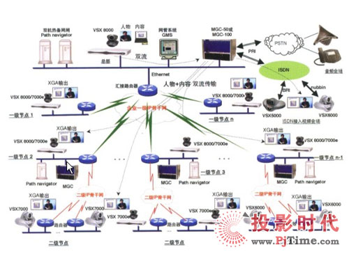 圖中總部及各視頻會場的終端可以根據(jù)各會場的功能需求、網(wǎng)絡(luò)環(huán)境選擇 Polycom