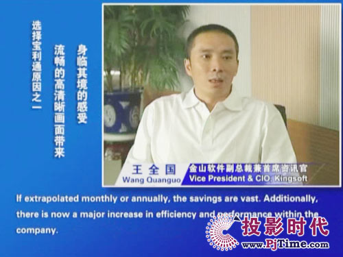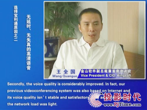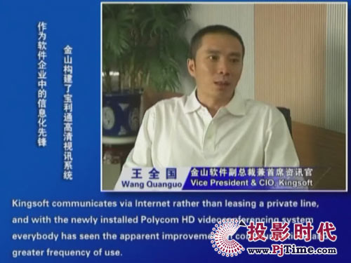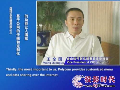 金山軟件副總裁兼首席資訊官王全國先生說道:“對于軟件行業(yè)來說,及時、高效的溝通是保持競爭優(yōu)勢的重要前提。相比之前使用的標(biāo)清產(chǎn)品,寶利通高清視頻會議系統(tǒng),提供了完全不同的體驗,流暢的高清晰畫面猶如真實的面對面溝通。而且我們公司并沒有申請專線,所有的應(yīng)用都是基于公網(wǎng)實現(xiàn)的。另一方面,新型全中文定制菜單的運用,令我們使用起來非常方便,這更提高了我們使用視頻通信手段實現(xiàn)異地溝通的熱情!