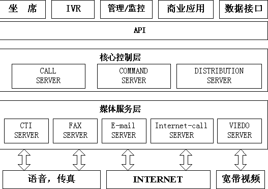 系統(tǒng)核心控制層由Call Server (呼叫控制)、Command Server(命令服務(wù))、Distribution Server(路由服務(wù)) 等功能模塊組成,分別用于呼叫信息的統(tǒng)一管理、命令的接收、命令格式轉(zhuǎn)換和轉(zhuǎn)發(fā)以及呼叫的分配和智能路由等。