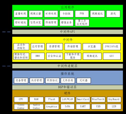 第三個(gè)中間件的可移植性可擴(kuò)展性。芯片廠家或第三方廠家提供的解決方案主要包括:硬件解決方案;實(shí)時(shí)操作系統(tǒng)層,包括了設(shè)備/網(wǎng)絡(luò)驅(qū)動(dòng)、文件系統(tǒng)、圖形/字體驅(qū)動(dòng)、網(wǎng)絡(luò)協(xié)議;瀏覽器模塊,其他模塊需要機(jī)頂盒制造廠家進(jìn)行研發(fā),而這些正是競(jìng)爭(zhēng)差異和難度所在。產(chǎn)業(yè)要做大,就需要更多的廠家進(jìn)入。理想的中間件客戶端基于操作系統(tǒng)層和硬件;使得更多的缺乏固網(wǎng)技術(shù)經(jīng)驗(yàn)的廠家能夠加入到機(jī)頂盒產(chǎn)業(yè)鏈中,專注于機(jī)頂盒基礎(chǔ)研發(fā)和生產(chǎn),使得中間件移植的難度最小、時(shí)間最短