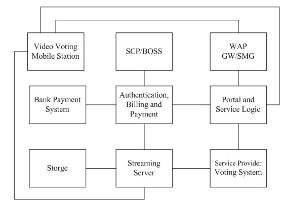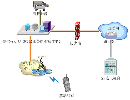 - 運(yùn)營(yíng)商建設(shè)的提供移動(dòng)視頻投票業(yè)務(wù)的移動(dòng)流媒體平臺(tái),該系統(tǒng)一方面可以接入電視信號(hào)向用戶即時(shí)播放音視頻賽況或搖珠過程,另一方面可以向用戶顯示賽況介紹和接收用戶的投票并進(jìn)行計(jì)費(fèi)處理。