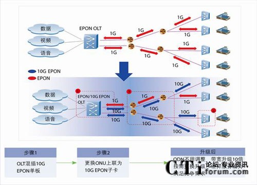 項目選取的試點(diǎn)小區(qū)建設(shè)于2006年,原來規(guī)劃的是每用戶6M帶寬。后期小區(qū)實裝率高,實際用戶超過1500戶,IPTV業(yè)務(wù)申請量提升后,出現(xiàn)了高峰時段IPTV點(diǎn)播業(yè)務(wù)不流暢、同時應(yīng)用IPTV和上網(wǎng)業(yè)務(wù)時網(wǎng)速過慢等問題。而且當(dāng)湖北電信新推出10M~20M的新寬帶套餐時,該小區(qū)用戶申請新套餐數(shù)量受限。該小區(qū)的寬帶接入網(wǎng)絡(luò)已經(jīng)明顯無法滿足用戶日益增長的需求,寬帶提速正當(dāng)其時。選擇10G EPON,能夠簡單兩步,將小區(qū)接入方式從EPON平滑升級為10G EPON,無需改變網(wǎng)絡(luò)結(jié)構(gòu),只需簡單升級設(shè)備(見圖)。