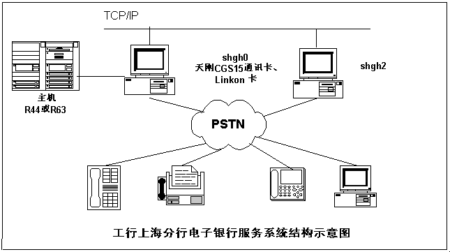 該系統(tǒng)以IBM提供的 R63和R44主機為中心,一臺Unix通信前置機通過CGS15通信卡與主機相連。該前置機與另一臺前置機連成局域網,對外提供74線語音、傳真和MODEM服務。今后隨著業(yè)務的增長,可以通過增加通信前置機方式,增加對外服務線路,從而使系統(tǒng)具有良好的開放性和擴展能力。
