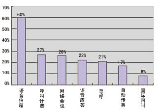 從企業(yè)所使用的CTI應(yīng)用服務(wù)來看:最多的是語音信箱(Voice Mail)為 60%。呼叫計費(Call Accounting)為27%,網(wǎng)絡(luò)會議(Conferencing)為26%。語音應(yīng)答(IVR)為22%。由于CTI在我們國家,這一兩年才得到比較快的發(fā)展,所以應(yīng)用層次還不是很高。還有一個原因是有些CTI技術(shù)的應(yīng)用在發(fā)展企業(yè)的核心業(yè)務(wù)方面作用不大,所以像Audio TEX、Powers Dialers等一些應(yīng)用就比較少。
