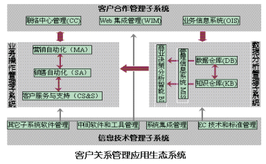 根據(jù)目前IT產(chǎn)業(yè)領(lǐng)域和管理界對CRM的開發(fā)、討論及應(yīng)用的經(jīng)驗(yàn)和反饋,綜合來講,一個(gè)完整的客戶關(guān)系管理應(yīng)用系統(tǒng)由如下四大生態(tài)子系統(tǒng)組成: