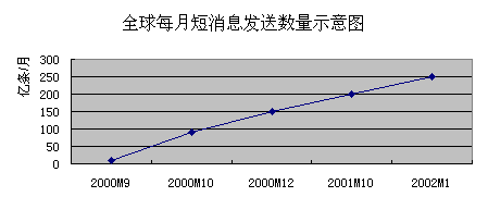 。。2001年全球的短消息服務業(yè)得到了迅猛的發(fā)展,全球共發(fā)送短消息2000億條。在中國短消息服務市場中,中國移動在2001年發(fā)送短消息159億條,中國聯(lián)通發(fā)送短消息30億條。隨著中國移動和中國聯(lián)通之間的互聯(lián)互通,中國短消息市場在2002年將達到300億條。并且中國電信和中國網(wǎng)通也加入到此市場中,中國固話短消息也將在此市場中占有一席之地。 中國的移動用戶在2002年4月已經(jīng)到了1.6億戶,并且還在以500萬戶/月的速度發(fā)展,估計到2005年中國的移動用戶將達到4.5億戶,中國手機用戶在35歲以下的占80%左右,他們是使用短消息的主體人群,因此中國移動短消息具有非常大的發(fā)展?jié)摿Α?/p>