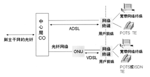 對數(shù)字信號處理要求,而且更加重要的是收發(fā)機成本與ADSL系統(tǒng)相比可以大大地降低。因此,對于用戶來說,假如采用了質(zhì)量較好的配線或引入線,那么,將FTTC(光纖到路邊)技術(shù),尤其是APON技術(shù)與VDSL技術(shù)相結(jié)合,作為ONU(光網(wǎng)絡單元)到用戶間的配線,通過FTTC為企業(yè)用戶和家庭提供寬帶接入,這樣可以實現(xiàn)設(shè)備成本和帶寬能力方面的平衡,由此看來,VDSL是一種比較現(xiàn)實理想的寬帶混合接入方案。VDSL拓撲結(jié)構(gòu)如圖1所示。