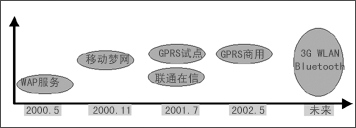 2000年5月,中國移動推出了WAP服務(wù),但是由于準(zhǔn)備不足,加之中國移動沒有完全轉(zhuǎn)變經(jīng)營理念,使得WAP服務(wù)沒有達(dá)到預(yù)期的發(fā)展目標(biāo)。在吸取WAP服務(wù)的經(jīng)驗、教訓(xùn)后,中國移動于2000年11月又推出了“移動夢網(wǎng)”計劃。在這次的業(yè)務(wù)推廣中,短消息受到了人們的寵愛,發(fā)展到現(xiàn)在,SMS已經(jīng)深入多數(shù)移動用戶的心中。2001年7月,中國聯(lián)通也推出了“聯(lián)通在信”與“移動夢網(wǎng)”進(jìn)行競爭(如圖1所示)。與此同時,中國移動又開始了GPRS的試點工作,經(jīng)過近一年時間,“聯(lián)通在信”并沒有取得更好的成績,而中國移動的GPRS終于開始正式商用。那么,未來的移動數(shù)據(jù)業(yè)務(wù)將依托什么來發(fā)展呢?是3G,還是WLAN、藍(lán)牙?大家只能拭目以待。