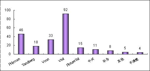 各品牌的認知度與其市場銷售情況息息相關(guān)。例如,VTEL是最早進入中國市場的視頻會議廠商,并在相當長的時期內(nèi)占據(jù)市場領(lǐng)先地位,取得顯著的品牌認知度是有其廣泛用戶基礎(chǔ)作為支撐的;POLYCOM雖然從1998年才開始進軍中國市場,但在基于IP的視頻會議系統(tǒng)的市場爭奪中取得較好的成績;PictureTel已經(jīng)被POLYCOM收購,品牌認知度也相對較低;而國內(nèi)品牌中興、華為剛剛起步,也很難達到較高的認知度。