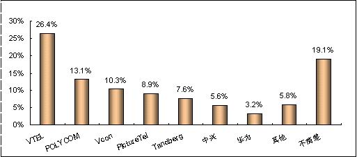 在無提示情況下,被調(diào)查者首先想到的視頻會議終端系統(tǒng)的品牌分布情況,即品牌第一提及率指標,可以反映出各品牌被用戶認知的廣泛程度。賽迪顧問調(diào)查數(shù)據(jù)顯示,第一提及率最高的品牌是VTEL,支持率達到26.4%,比處于第二位的品牌高出13.3個百分點;其次是POLYCOM和Vcon,支持率達到13.1%和10.3%。(見圖5)