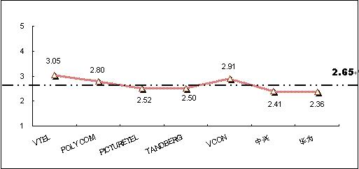 為深入了解和對比被調(diào)查者對不同品牌視頻會議終端系統(tǒng)產(chǎn)品的認知程度,本次調(diào)查將被調(diào)查者對各主要品牌的了解程度劃分為五個檔次,對不同的檔次賦予不同的分值,分別為“非常了解(5分)”、“了解(4分)”、“一般(3分)”、“不了解(2分)”、 “非常不了解(0分)”,同時綜合考慮以購買用戶擁有的品牌分布,借以比較不同品牌在認知度上的差異。統(tǒng)計結(jié)果顯示,目前在中國市場上,用戶對主要視頻會議終端系統(tǒng)產(chǎn)品品牌的了解程度的平均值為2.65,各品牌認知度分值見圖6。其中:VTEL品牌的知名度最高,指標值為3.05,超過了“一般”了解水平;其次為VCON品牌,指標值為2.91;POLYCOM的知名度指標值為2.8,處于第三位。除VTEL品牌外,其他主要品牌的知名度還都處于低于“一般”了解水平階段,反映出產(chǎn)品的市場認知還較低。