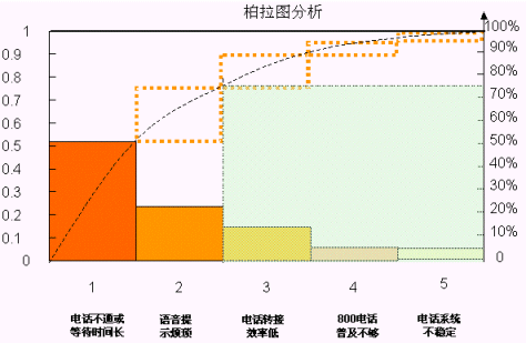通過匯總的數(shù)據(jù)進行分析,他們發(fā)現(xiàn)客戶不滿意的原因很多,于是選取了最大的五個原因, 用"柏拉圖"做了分析,同時,對于這最重要的五個原因又作了一次頭腦風(fēng)暴和"魚骨圖分析"。