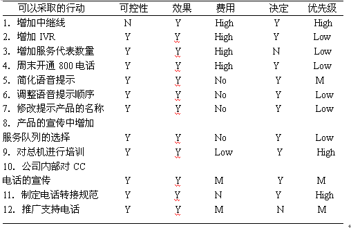 項目小組接下來對列舉的眾多原因合并、歸類并再次進行頭腦風(fēng)暴,并"可控性"、"實施預(yù)期效果"、"實施費用"、"是否可以由項目小組作決定"、"優(yōu)先級"等幾個方面對可以采取的行動進行逐項分析(見下圖),最終確定1、5、9、10、11、12項納入到實施方案,指定相應(yīng)的實施負責(zé)人,制定相應(yīng)實施時間表,實施時長為三個月。