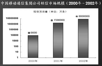 信息產(chǎn)業(yè)部預(yù)測(cè),2003年我國手機(jī)用戶將增加5000多萬,手機(jī)用戶短信普及率有可能從2002年的40%增加到60%。按照這種預(yù)測(cè),2003年,全國短信發(fā)送量將達(dá)到2000億條。