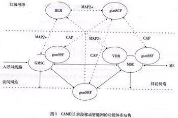 在移動通信領域,歐洲電信標準學會(ETSI)制定的CAMEL系列標準為基于GSM移動通信網(wǎng)絡的移動智能網(wǎng)提供了統(tǒng)一的規(guī)范。其中CAMEL2階段的標準符合ITU-T的IN CS-1,支持各種基于語音的智能業(yè)務。CAMEL2階段移動智能網(wǎng)的功能體系結(jié)構如圖1所示。CAMEL3階段的標準基于CS-2,主要增加了對GPRS移動數(shù)據(jù)業(yè)務以及短消息業(yè)務的支持。