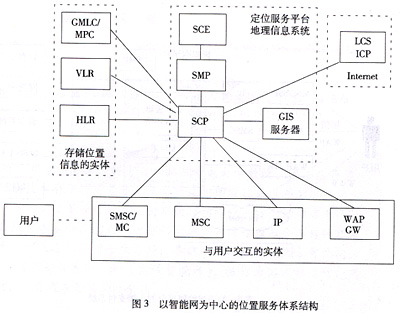 基于智能網(wǎng)的位置業(yè)務體系結(jié)構如圖3所示。在此系統(tǒng)里,SCP一方面與網(wǎng)絡中存儲位置信息的實體(如HLR、GMLC/MPC等)互連,以獲取位置信息;另一方面與內(nèi)部的地理信息系統(tǒng)(GIS)服務器和Internet上的LCS