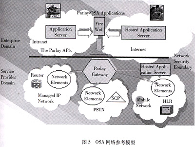 為了克服傳統(tǒng)智能網(wǎng)的上述不足,開放業(yè)務體系結(jié)構(OSA,Open Service Architecture)應運而生。如圖5所示,OSA是一種全新的業(yè)務體系結(jié)構,主要包括底層通信網(wǎng)絡,高層的應用服務器(Application