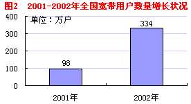 易觀咨詢的電信分析師顧先立說,固網市場的飽和與移動通信對固網的替代使得中國電信、中國網通這兩家固網運營商向新業(yè)務求助,主要是由DSL(數(shù)據用戶線)技術推動的寬帶接入業(yè)務來帶動整體收入的增長;而且,運營商希望能通過寬帶接入向用戶提供將來能帶來更多收入的增值業(yè)務。在前述動機和積極推廣下,2000年起,寬帶用戶數(shù)大幅增長。截至2002年底,全國4850萬互聯(lián)網用戶中有334萬寬帶用戶,而2001年底為98萬用戶數(shù),去年凈增236萬。中國電信2002年顯示,其寬帶用戶增長了98.2萬,達到137.9萬,較2001年底增長247.4%。今年,中國電信集團和中國網通的目標是總共增加370萬寬帶用戶,達到700萬。