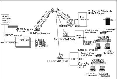 中國(guó)衛(wèi)通的“衛(wèi)星寬帶視頻會(huì)議系統(tǒng)”是一個(gè)典型的IPSat系統(tǒng),由一個(gè)發(fā)送高速上行廣播的主站和使用IPSat終端的多個(gè)遠(yuǎn)端站構(gòu)成。