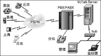 用語音板卡搭建電話會(huì)議一般注重在單一的音頻通信。考慮到單純的音頻或視頻會(huì)議模式都或多或少有各自的局限性,宇音將數(shù)據(jù)與語音整合在一起,實(shí)現(xiàn)音頻/圖文會(huì)議。VCTalk各系列電話會(huì)議系統(tǒng)采用高性能的語音/會(huì)議資源卡作為硬件支持,可實(shí)現(xiàn)多方電話會(huì)議(≥8),具有多組會(huì)議、與會(huì)者身份認(rèn)證、設(shè)置會(huì)議主持人、邀請(qǐng)與會(huì)者、會(huì)議通知、會(huì)議內(nèi)容同步播放、會(huì)議密碼保護(hù)、智能播放、會(huì)議內(nèi)容全程錄音/存儲(chǔ)、本地/遠(yuǎn)程查聽會(huì)議錄音的功能,并可以對(duì)企業(yè)內(nèi)部發(fā)生的呼叫記錄進(jìn)行計(jì)費(fèi)和統(tǒng)計(jì)。針對(duì)中小企業(yè)辦公靈活的特點(diǎn),VCTalk系統(tǒng)搭建簡單易行,其結(jié)構(gòu)圖見圖1。