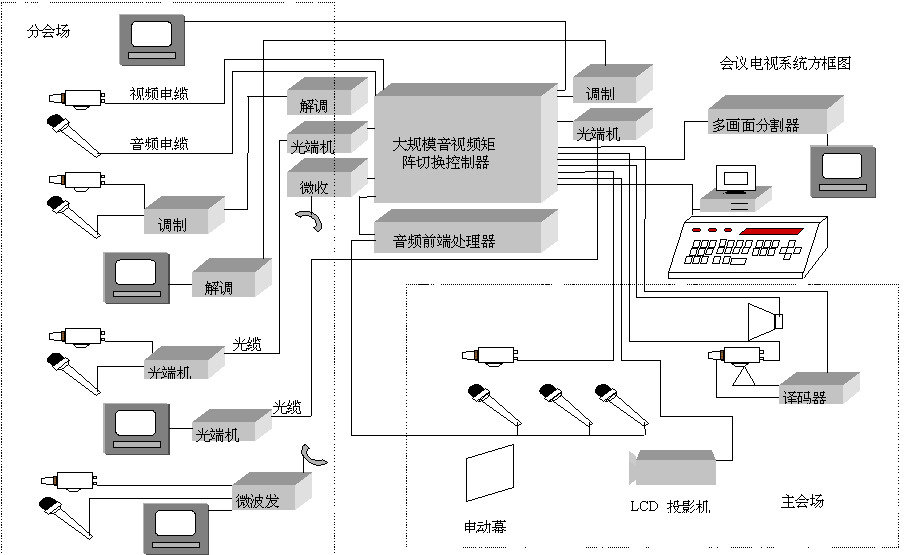 會議主機實現(xiàn)分會場和主會場的電視信號的交互切換,將各個分會場的電視信號送到液晶投影儀上顯示,采用液晶投影儀作大屏幕顯示在電視墻顯示方式,投資小,設(shè)有閃爍感,使主會場人員的視覺更舒適(參見系統(tǒng)圖)。