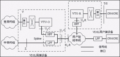VTU-R分別是位于局端和用戶端的VDSL收發(fā)器。業(yè)務(wù)分離器(Splitter,包括HPF和LPF)將同一對(duì)電話銅纜上傳輸?shù)腣DSL與窄帶業(yè)務(wù)(或ADSL)