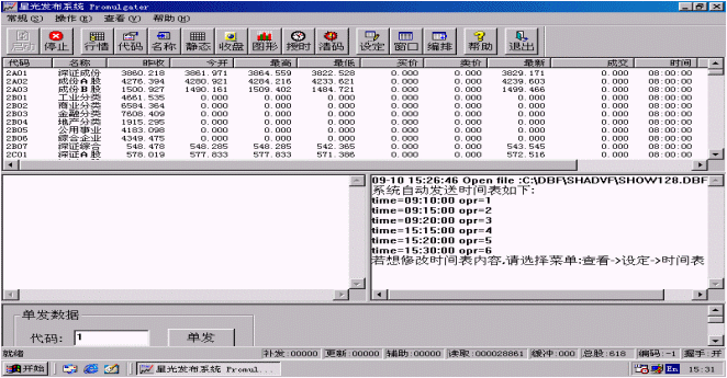 行情也可以單發(fā),只要在進行證券信息發(fā)布時在程序主界面的下方<單發(fā)數(shù)據(jù)>區(qū)輸入要單發(fā)的股票代碼,然后點擊<單發(fā)>按鈕,系統(tǒng)就會盡快刷新該只股票。