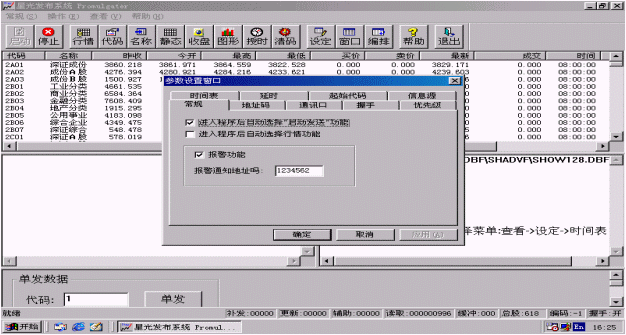常規(guī)設(shè)置有可選擇<進入程序后自動選擇"啟動發(fā)送"功能>、<進入程序后自動選擇行情功能>、<報警功能>及報警通知地址碼的設(shè)置。啟動報警功能后,當(dāng)信息源中斷時系統(tǒng)就會發(fā)出報警通知。