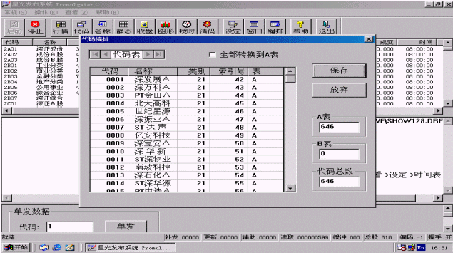代碼編排是指用戶根據(jù)證券數(shù)據(jù)記錄在數(shù)據(jù)庫中的位置重新排定股票的索引位置,索引次序可不同于證券代碼的次序,也不是數(shù)據(jù)庫中記錄的次序,用戶可根據(jù)需要自己設(shè)定,將來發(fā)布信息時就按此索引次序(索引號)所指向的股票信息位置取信息進行發(fā)布。