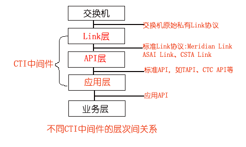 在Link層的基礎(chǔ)上,實現(xiàn)把標(biāo)準(zhǔn)Link協(xié)議轉(zhuǎn)化為標(biāo)準(zhǔn)的API,如CTC API、TAPI、JTAPI等,為CTI應(yīng)用開發(fā)提供一套標(biāo)準(zhǔn)的API,屏蔽了不同交換機(jī)擁有的CTI協(xié)議和CTI接口,使應(yīng)用程序員無需關(guān)心消息是如何在計算機(jī)和交換機(jī)之間傳遞,專注于客戶端的應(yīng)用開發(fā),實現(xiàn)應(yīng)用程序與交換機(jī)平臺無關(guān)性。