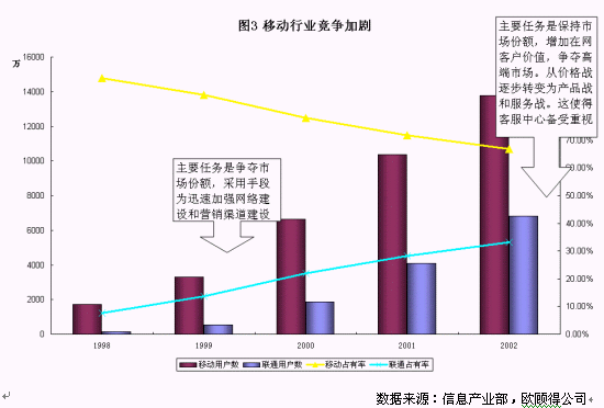 拿移動通訊業(yè)務(wù)來說,如圖3所示,截至到2002年底,中國移動的市場份額大約在65%,而聯(lián)通為35%左右,網(wǎng)絡(luò)覆蓋以及質(zhì)量也越來越趨同。從國內(nèi)國外的經(jīng)驗來看,移動通訊市場的競爭正從爭奪市場份額轉(zhuǎn)變?yōu)楸3质袌龇蓊~和增加客戶價值,而主要手段正也從網(wǎng)絡(luò)建設(shè)、營銷渠道建設(shè)、價格戰(zhàn)等轉(zhuǎn)變?yōu)楫a(chǎn)品戰(zhàn)和服務(wù)戰(zhàn)。在這個階段,兩家主要的運營公司都對客戶服務(wù)非常重視。服務(wù)水平的達(dá)標(biāo),投訴流程的梳理,呼叫中心的擴(kuò)大規(guī)模,電話營業(yè)廳的建設(shè)等工作是今年的重點。