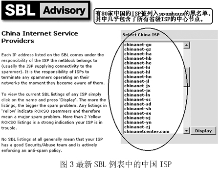 垃圾郵件損害的不只是中國的國際形象,中國反垃圾郵件聯(lián)盟的葉豪告訴記者,類似SBL(更一般的是RBL,即“實時黑名單”)這樣的服務(wù)是由國外的一些公司或第三方組織提供的,目前已經(jīng)成為國際上比較通行的防范垃圾郵件的措施。而在具備較高知名度的Spamhaus所維護(hù)的這份黑名單中,我國的ISP竟然多達(dá)80家(如圖3),幾乎所有的省級ISP都位列其中!爸袊芏啻蟮腎SP都在不同的‘黑名單’里,從這些國內(nèi)ISP發(fā)出的郵件,那些用‘黑名單’的客戶根本就收不到,F(xiàn)在‘黑名單’是比較好用的一種辦法,所以使用‘黑名單’服務(wù)的企業(yè)也越來越多,國際上針對中國的信息壁壘就越來越厲害,再不采取措施,中國就等著被全世界‘封掉’吧!”