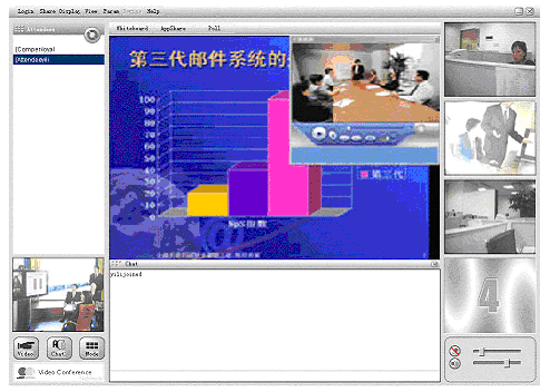 計算機、網(wǎng)絡(luò)技術(shù)高速發(fā)展的今天,傳統(tǒng)的通訊方式日益滿足不了人們的要求。人們要求能進行遠程會議,開展面對面的交流;同時,在滿足傳統(tǒng)視頻會議音/視頻通信的基本要求之外,現(xiàn)代會議更希望能夠提供更加豐富多樣的會議討論形式和功能,比如:遠程開展季度/年度預(yù)算及工作計劃的討論,需要遠程共享PPT等演示文檔和EXCEL等表格,需要共同就某一網(wǎng)上信息開展討論,甚至能夠?qū)㈤_會的通知通過電子郵件和手機短消息的方式傳達到每一個與會者那里。